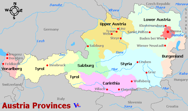 Lower Austria (Niederosterreich), Burgenland, Styria (Steiermark), Vienna (Wien).
